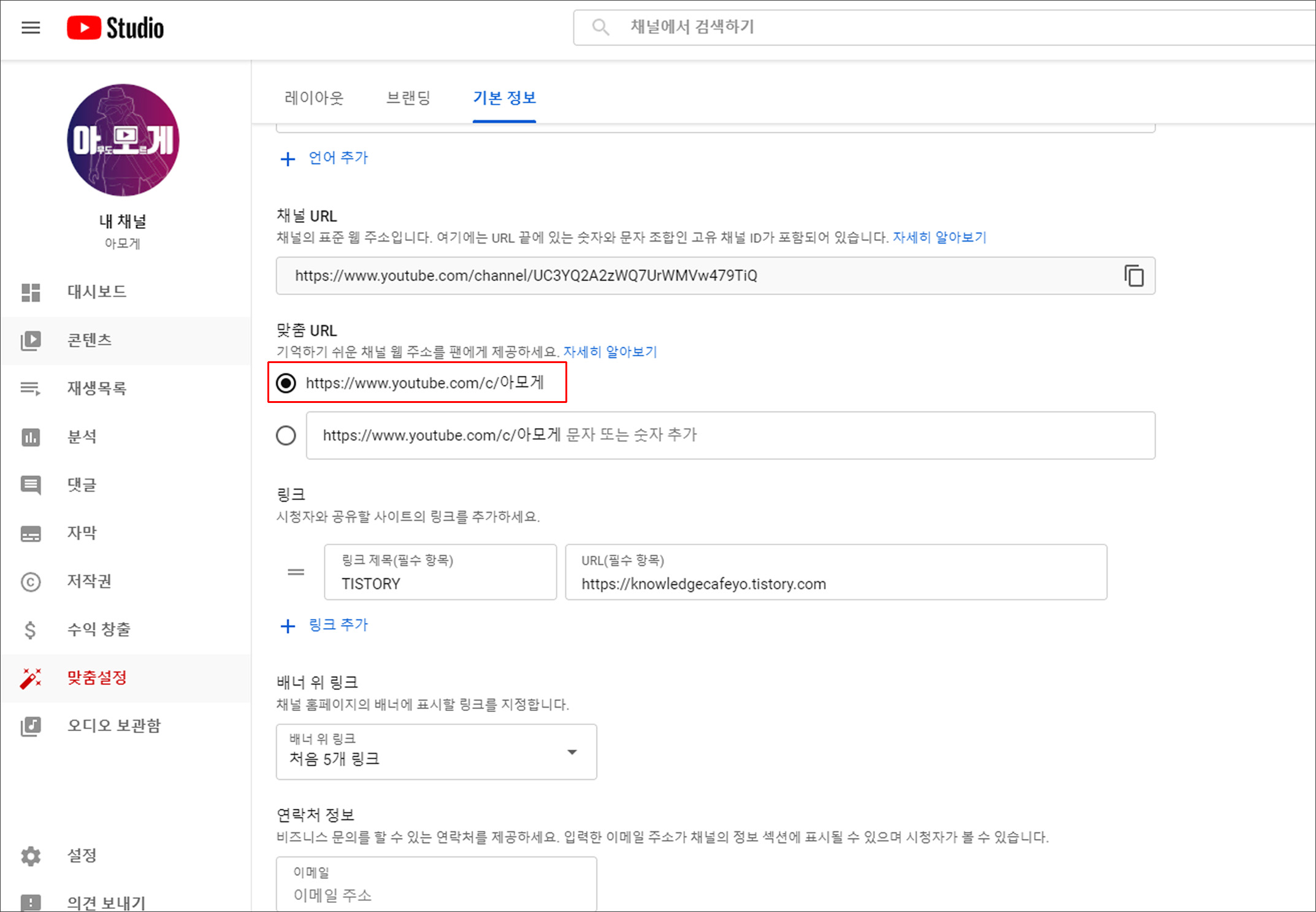 자격요건에 해당이 되시는 분들은 채널 맞춤 URL 설정하기 클릭하면