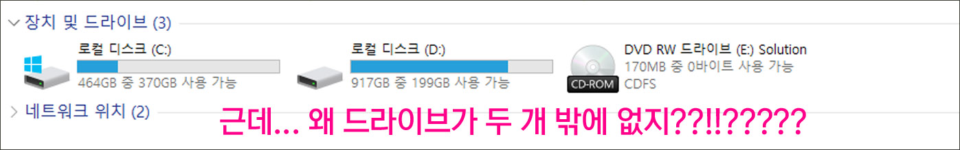 하지만, 내PC에 들어가면 C와 D드라이브 밖에 없습니다.