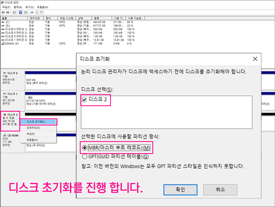 2TB를 초과하는 용량은 GPT로 하시고, 그 이하는 MBR로 설정하시고 확인하십쇼!