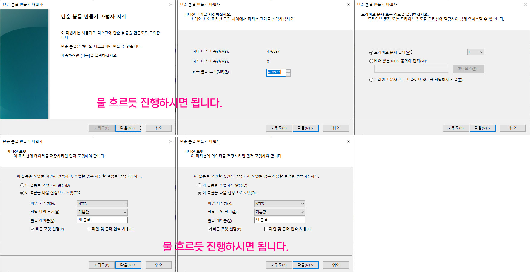 그리고 할당되지 않음 이라고 표시 된 부분은 볼륨 설정하여 활성화 시켜주시면 됩니다.