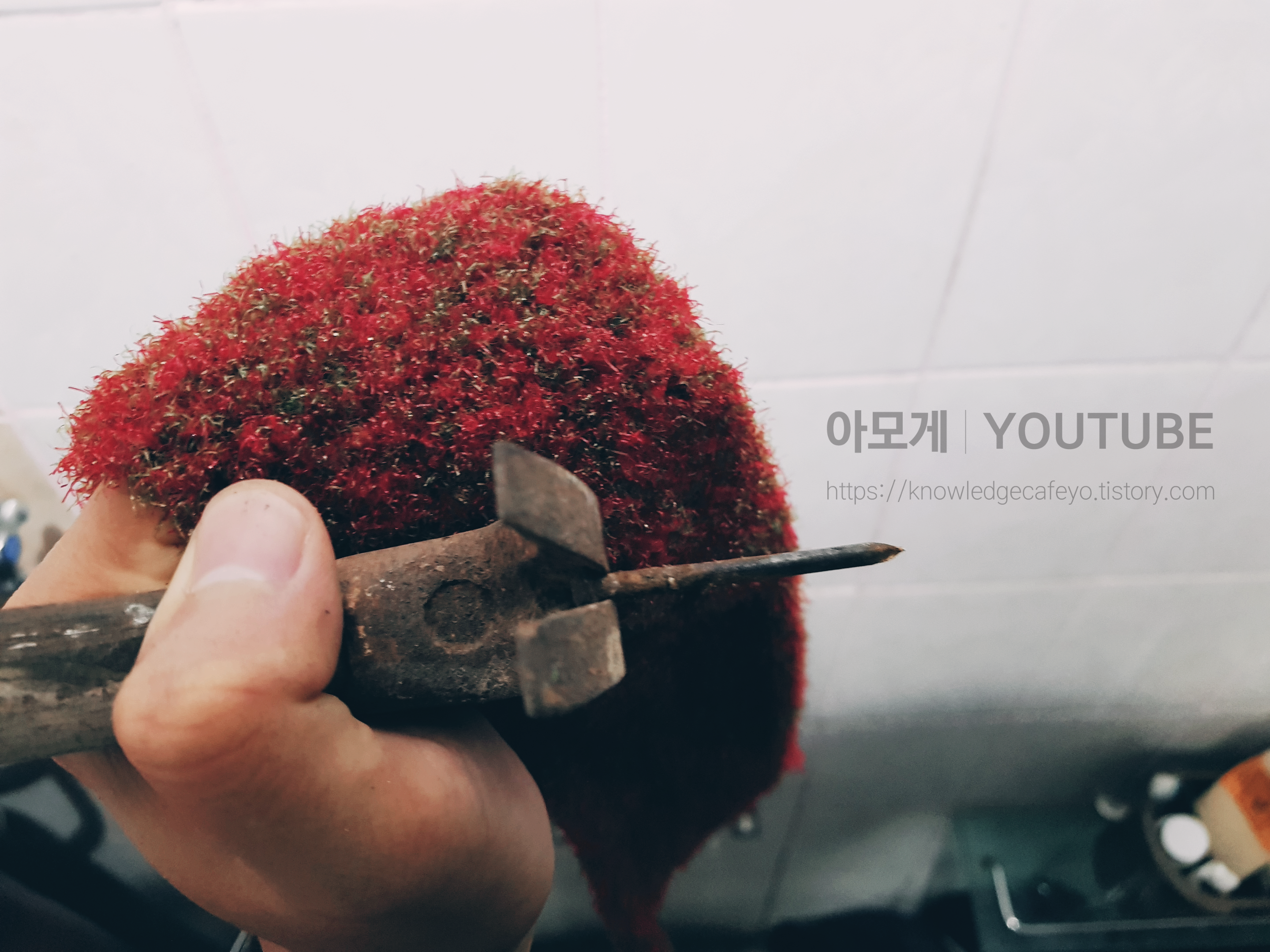 망치 뒷부분으로 못을 쑤욱!! 빼줍니다. 다행히도 타일 손상 없이 못을 제거해 주었습니다.